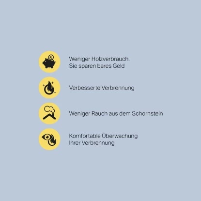 Die fortschrittliche Steuerungsbox von Aduro ist ein Gerät mit zwei Sensoren, das drahtlos kommuniziert. Diese überwachen die Verbrennung im Ofen, während Sie in der App alle wichtigen Informationen auf einen Blick haben. Sie verrät Ihnen wann Sie Brennholz nachlegen sollten, wie warm Ihr Ofen ist und ob der Kamin bei zu hoher oder niedriger Temperatur heizt. Das System misst Ihre Feuerleistung und wertet sie aus. Die Daten können dann sogar mit den Ergebnissen von anderen Nutzern in Europa verglichen werden.