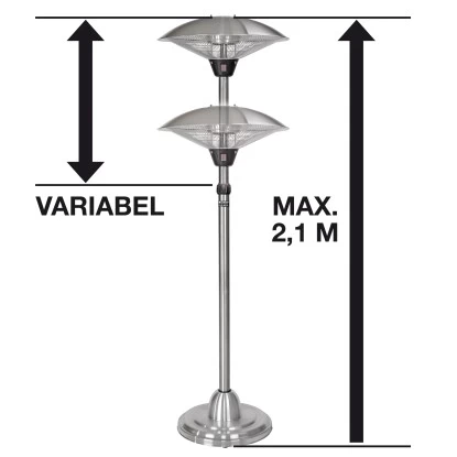 Der Halogenheizer NHH 2100 ist mit einem 2-teiligen Teleskoprohr aus rostfreiem Stahl ausgestattet und daher bis auf 2,10 Meter bequem höhenverstellbar. Durch ein Sicherheits-Abdeckgitter sowie den integrierten Kippschutz ist der sichere Betrieb gewährleistet, da sich das Gerät automatisch ausschaltet, sobald es kippt. Zudem verfügt dieser Halogenheizer über einen Reflektor und eine Sockelabdeckung aus Aluminium. Gumminetzleitung und zwei Ein-/Ausschalter runden das Angebot ab.
