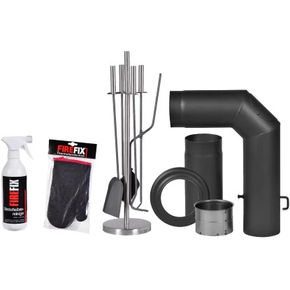 Das praktische Zubehör-Set von Firefix eignet sich zur Inbetriebnahme Ihres Scheitholzofens. Mit einem Rauchrohranschluss-Set in Schwarz (150 mm Durchmesser, mit Regulierklappe und Reinigungsöffnung inkl. Wandfutter und Abdeckrosette) können Sie die Feuerstellen an den Schornstein anschließen. Für den Betrieb erhalten Sie zusätzlich einen Glasscheibenreiniger zum Reinigen der Scheiben, ein dekoratives fünfteiliges Kaminbesteck sowie einen Thermohandschuh.