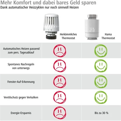 Das weiße Hama Heizkörper-Thermostat Smart WiFi für Hama Heizungssteuerung Wlan ist die passende Erweiterung zur Hama Heizungssteuerung um weitere Heizkörper mit smarten Thermostaten auszustatten und Heizzyklen zu programmieren, die zum individuellen Tagesablauf passen um dadurch Energie sparen und Heizkosten senken zu können, z.B. Heizung ausschalten, wenn eine bestimmte Zieltemperatur erreicht ist.