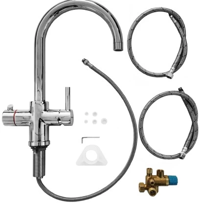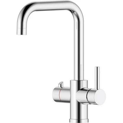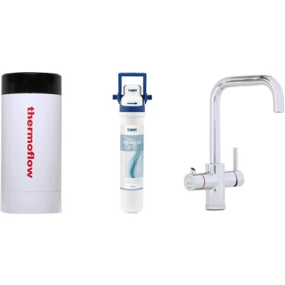 Die Thermoflow Kochendwasser-Armatur THERMOFLOW100E mit eckigem Auslauf besteht aus einem Kessel mit kochendem Wasser und einer 3-in-1-Armatur mit eckigem Auslauf die über eine Funktion für kochendes Wasser verfügt. Die maximale Warmwassertemperatur am Kessel kann eingestellt werden, zum Beispiel auf 70 °C oder 100 °C . Da Sicherheit bei Thermoflow an erster Stelle steht, sind sowohl die Armatur, als auch der Kessel mit kindersicheren Funktionen ausgestattet. Die BWT MyAQUA Soft Filterkartusche veredelt in vier Filtrationsstufen Ihr Leitungswasser zu bestem, gefiltertem Wasser.