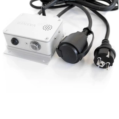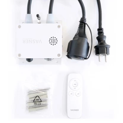 Mit der kompakten Vasner Bluetooth Dimmer Box können Sie ab sofort elektrische Infrarotheizstrahler aller Marken im Innen- und Terrassenbereich fernsteuern. Sowohl mit einer normalen Fernbedienung als auch per Handy mit Bluetooth über die Vasner App. Der neue Bluetooth Dimmer macht jeden Heizstrahler, der bislang keine Heizstufen bzw. nur ein Leistungsniveau hat, steuerbar! Mit diesem tollen Zubehör haben Sie die Möglichkeit, Ihren Infrarotstrahler aus der Ferne zu steuern und zu dimmen. Sowohl in 6 Stufen per Fernbedienung, als auch stufenlos mit der App. Außerdem verwandelt es in kurzer Zeit jeden gängigen auf dem Markt erhältlichen Terrassenstrahler (ohne Schaltfunktion) in ein modernes, per Handy App steuerbares Gerät. Die Vasner Heating App steht zum kostenlosen Download bereit (iOS und Android). Weiterhin liegt dem Bluetooth Dimmer im Lieferumfang eine moderne Handfernbedienung bei, die zur einfachen Steuerung dient. Die gewohnt klassische Alternative zur App-Steuerung. Stecken Sie einfach die Bluetooth Dimmer Fernsteuerung zwischen Infrarotstrahler und Stromnetz, und schon kann jeder Terrassenheizer sofort ferngesteuert und gedimmt werden. Sogar auf der Terrasse, denn der Bluetooth Dimmer verfügt über die Schutzklasse IP65 (Staub- und Strahlwasserschutz) für maximale Sicherheit im Außenbereich. Dank Bluetooth Box können Sie jeden handelsüblichen Infrarotstrahler mit einer Gesamtleistung von bis zu 3.000 W fit für die Fernsteuerung machen. Terrassenstrahler, Deckenheizstrahler, Wandheizstrahler und Standheizstrahler. Sollte das Handy oder die Fernbedienung einmal nicht zur Hand sein, kann der Infrarotstrahler auch manuell direkt am Bluetooth Dimmer per Knopfdruck gedimmt und an- oder ausgeschaltet werden. So haben Sie stets 3 Möglichkeiten der Schaltung. Denn sicher ist sicher. Produktmerkmale: – Produkt: Vasner Bluetooth Dimmer Box – Maße (H x B x T): 12 cm x 11,5 cm x 5,3 cm – Gehäuse: Aluminium – Geeignet für Infrarotheizstrahler aller gängigen Hersteller, die bisher nur über eine einzelne Heizstufe verfügen – Gesamtleistung: max. 3.000 W – Wärmeregulierung über Smartphone / Tablet (iOS & Android) mit kostenloser Vasner App – Individuelle Bezeichnung aller Geräte möglich, die über die App angesteuert werden – Stufenlose Wärmeregulierung (per App), oder alternativ in 6 Stufen (per Fernbedienung) – Bluetooth Reichweite: bis zu 50 m (kein Sichtkontakt notwendig) – Inkl. Infrarot-Fernbedienung (bis 6 m Reichweite) – Integrierter Schalter zur manuellen Bedienung – Timer-Funktion (programmierbares Abschalten) – IP65 (wasserfest, daher auch für Außenbereiche geeignet) – Kabellänge: 1,9 m (inklusive Stecker) Lieferumfang: – 1 x VASNER Bluetooth Dimmer Box für Infrarotstrahler – 1 x Montage Set (4 Dübel, 4 Schrauben) – 1 x Fernbedienung – 1 x Bedienungsanleitung – Batterien nicht enthalten (2x AAA 1,5V für die Fernbedienung)