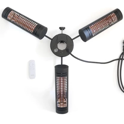 Mit der Umbrella X30 Serie bietet Vasner Heizstrahler zur Montage an Sonnenschirmen jeder Art (mit einem Stangendurchmesser von 40 mm – 80 mm). Die drei Infrarotstrahler sind schon fest an der Halterung angebracht und können einfach und schnell an verschiedenen Stangen montiert werden. Für wohlige Infrarotwärme im 120 – 360 ° Radius um Ihren Sonnenschirm herum sind die einzelnen Schirm Heizstrahler separat an- / ausschaltbar. Dabei sind die besonderen Terrassen-Heizstrahler in den Farben Silber und Schwarz erhältlich, um Ihnen das ideale Modell zur Kombination mit Ihrer bestehenden Einrichtung zu bieten. Zur Montage müssen Sie lediglich die Halterung öffnen, an Ihren Terrassenschirm hängen und ganz einfach per Stellschraube an den Durchmesser der Stange anpassen. Schon können Sie losheizen! Die beiliegende Fernbedienung ermöglicht eine bequeme Bedienung der drei Infrarot-Heizstrahler für insgesamt 3000 Watt Wärme um Ihren Sonnen- oder Gastroschirm herum. Manuell lassen sich die drei Terrassenheizer jeweils um 90 ° (horizontal, vertikal) schwenken, damit Sie zwischen einer breitflächigen und punktuellen Strahlung entscheiden können. Vor allem für den dauerhaften Gebrauch draußen in der Gastronomie ist die Schutzklasse IP65 gegen Strahlwasser ein absolutes Muss. Zu einer gemütlichen Atmosphäre trägt darüber hinaus die Ultra Low Glare Röhre der Sonnenschirm Heizstrahler bei, die das abgegebene Licht der Terrassenstrahler auf ein stimmungsvolles Leuchten reduziert. Gleichzeitig ist die erzeugte, kurzwellige Infrarotstrahlung besonders intensiv, um sogar bei Wind für zuverlässige Wärme zu sorgen.