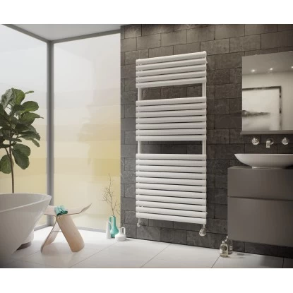 Die ausgewogene und harmonische Verteilung und Charakteristik der ovalen Horizontalprofile verleihen dem Designheizkörper Nestor die eigene, moderne Optik. Zusätzlich ideal als Handtuchwärmer und Handtuchtrockner verwendbar.